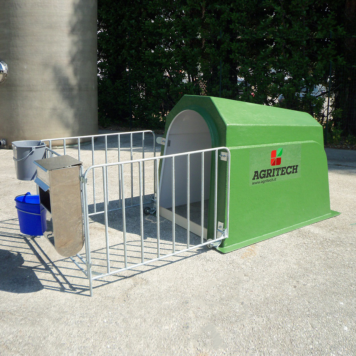 Box para terneros mod. AGRIBOX1C de fibra de vidrio de poliéster con cerca y barreras metálicas y completo con:
